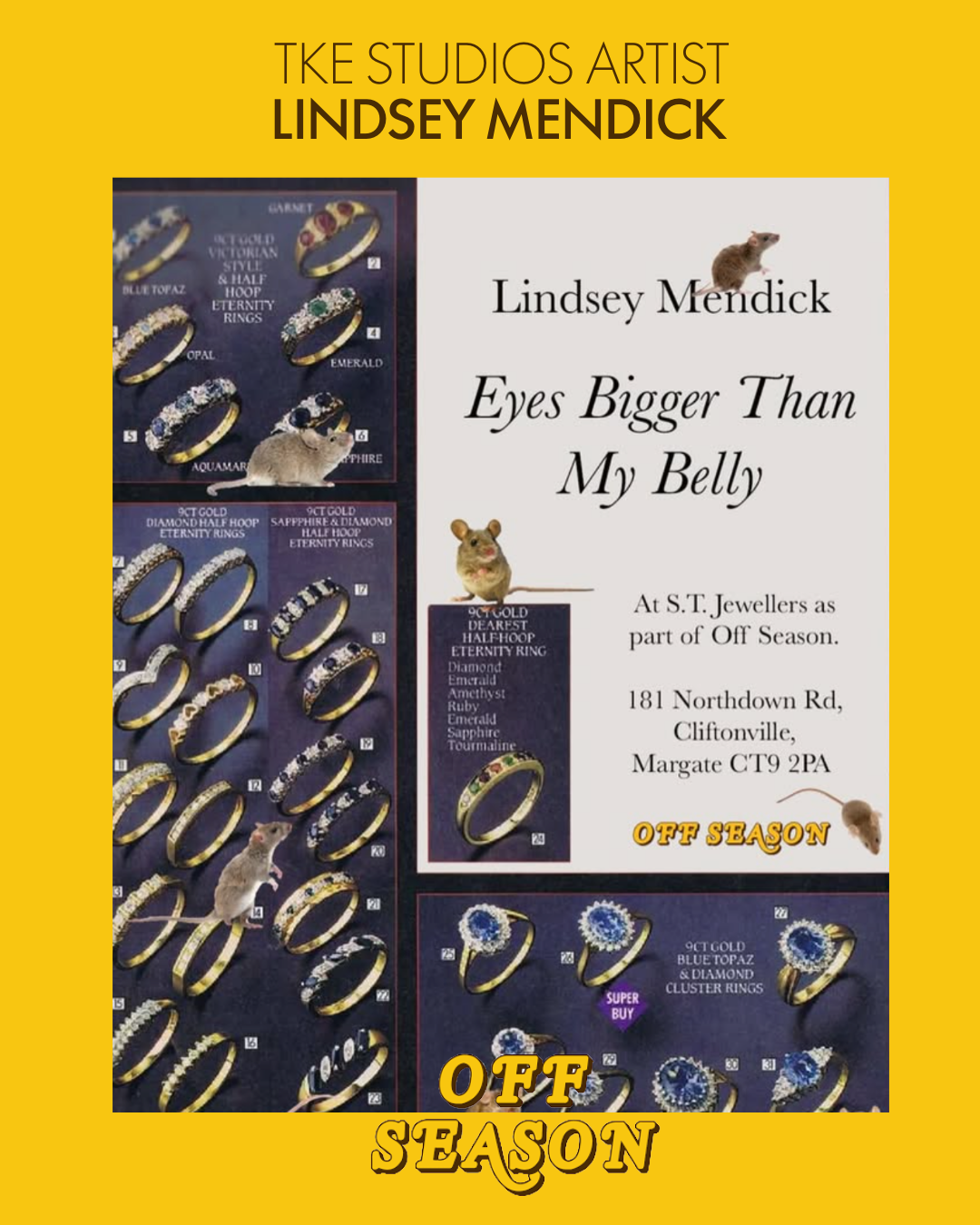 23–25 January Lindsey Mendick opens Eyes Bigger Than My Belly A bold, hungry exhibition landing in the high street for Off Season.